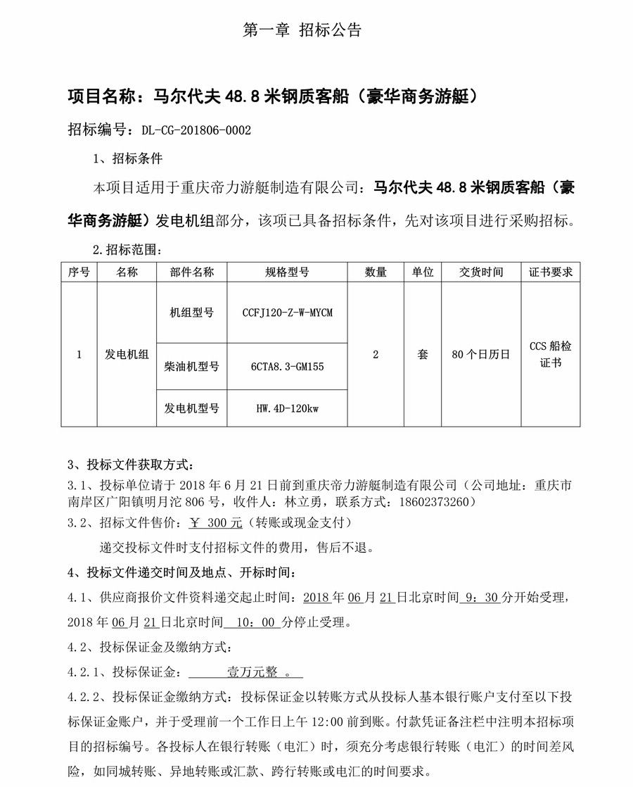 馬爾代夫48.8米鋼質(zhì)客船(豪華商務(wù)游艇)發(fā)電機組部分采購招標(biāo)