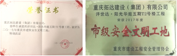 2018年3月16日,經(jīng)重慶市建設(shè)工程安全管理協(xié)會(huì)嚴(yán)格甄選,洋世達(dá)·南濱特區(qū)(陽(yáng)光華庭五期)二區(qū)T2號(hào)樓項(xiàng)目榮獲“2017年度市級(jí)安全文明工地”的稱(chēng)號(hào)。