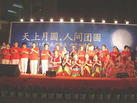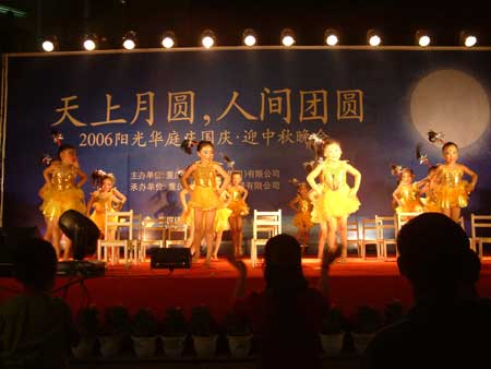 國(guó)慶中秋兩節(jié)遇,合家團(tuán)圓精神俱。2006年9月28日晚19:30,“陽(yáng)光華庭”一期大門口熱鬧非凡,華燈璀璨。“天上月圓、人間團(tuán)圓--陽(yáng)光華庭2006慶國(guó)慶迎中秋文藝晚會(huì)”在這里隆重舉行,來(lái)自小區(qū)的上千名業(yè)主觀看了此次晚會(huì)。